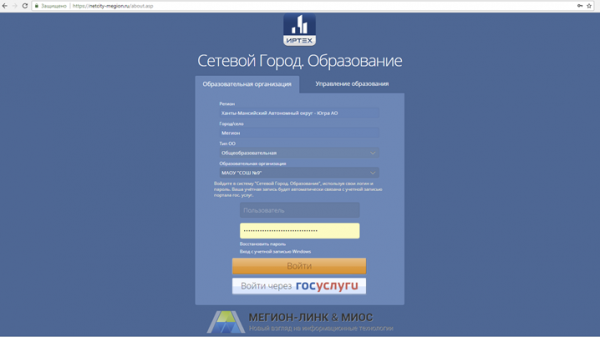 Для того чтобы зайти в АИС «Сетевой город. Образование» необходимо в адресной строке браузера набрать https://netcity-megion.ru/ появится окно: